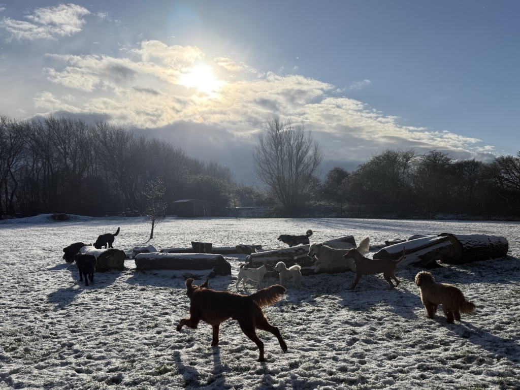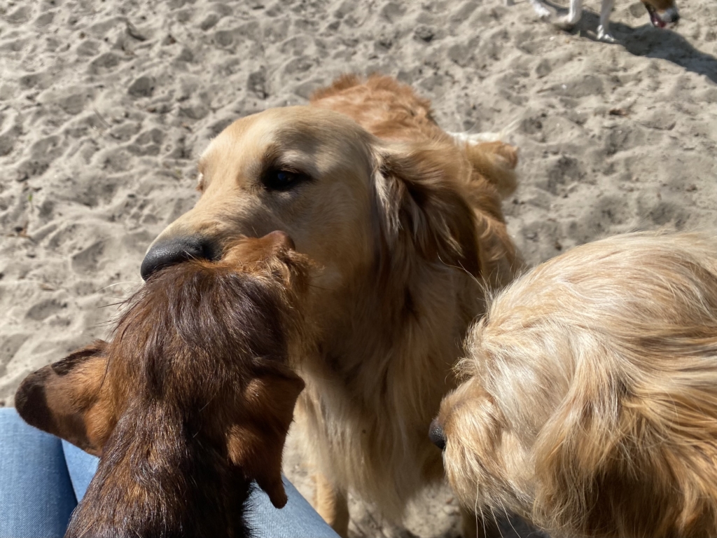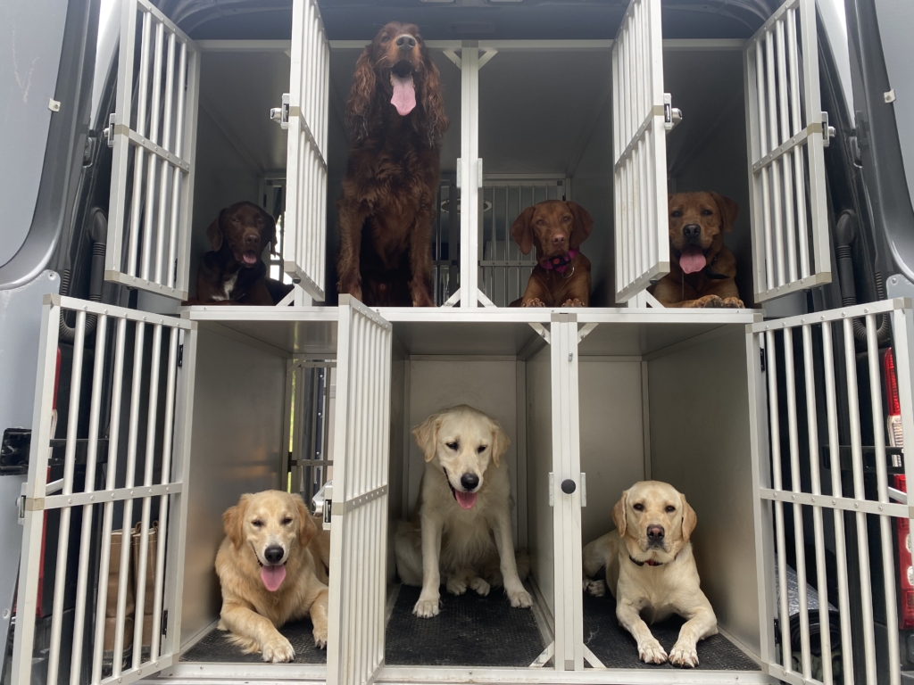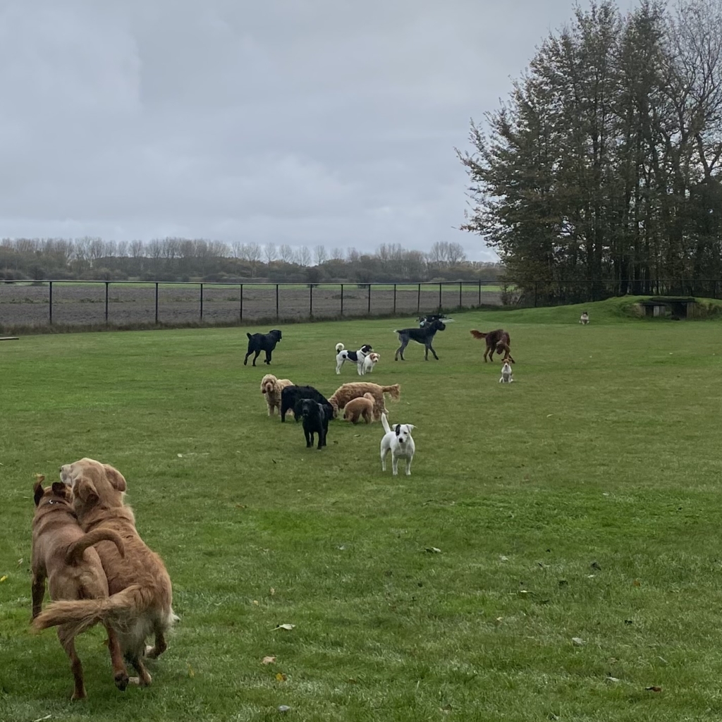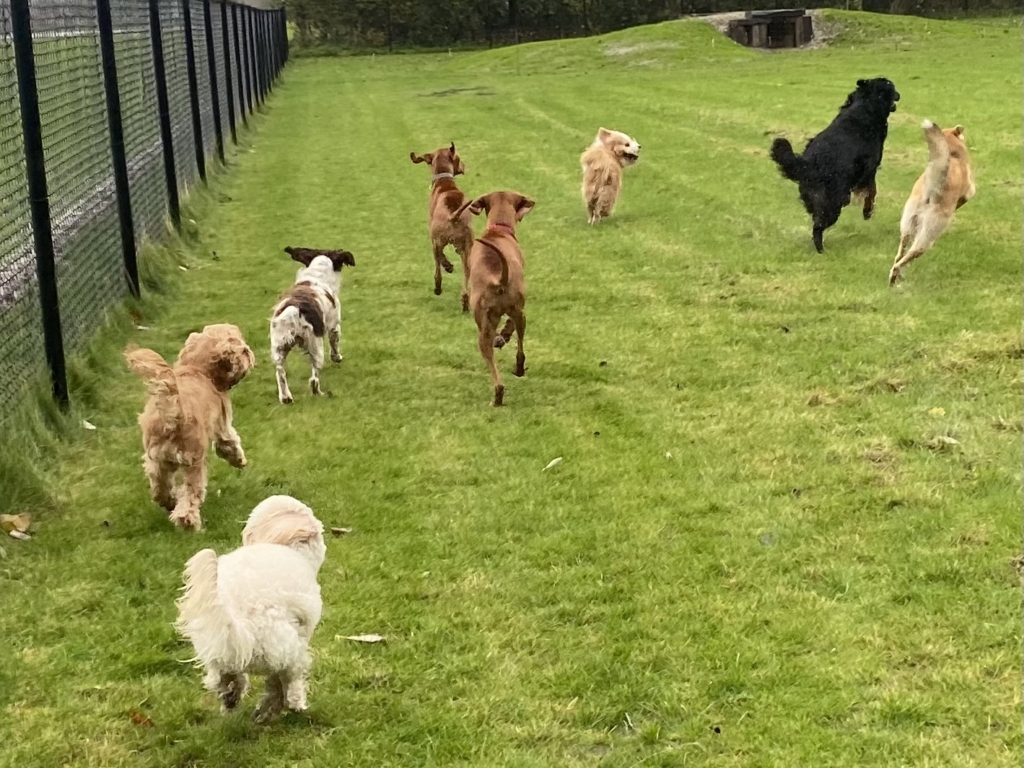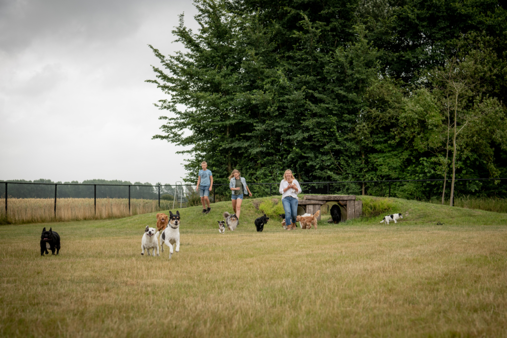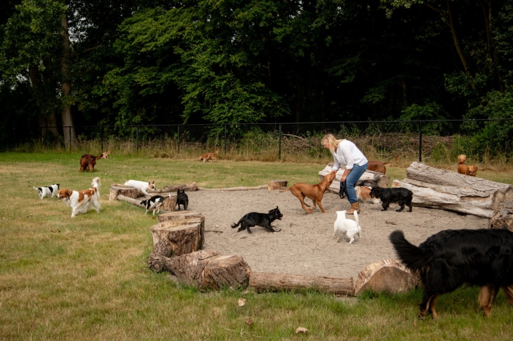 Als alle hondjes opgehaald zijn rijden we naar ons eigen natuurlijk aangelegde terrein waar ze een uur los kunnen lopen in een nauwkeurig samengestelde groep zodat plezier voorop staat.